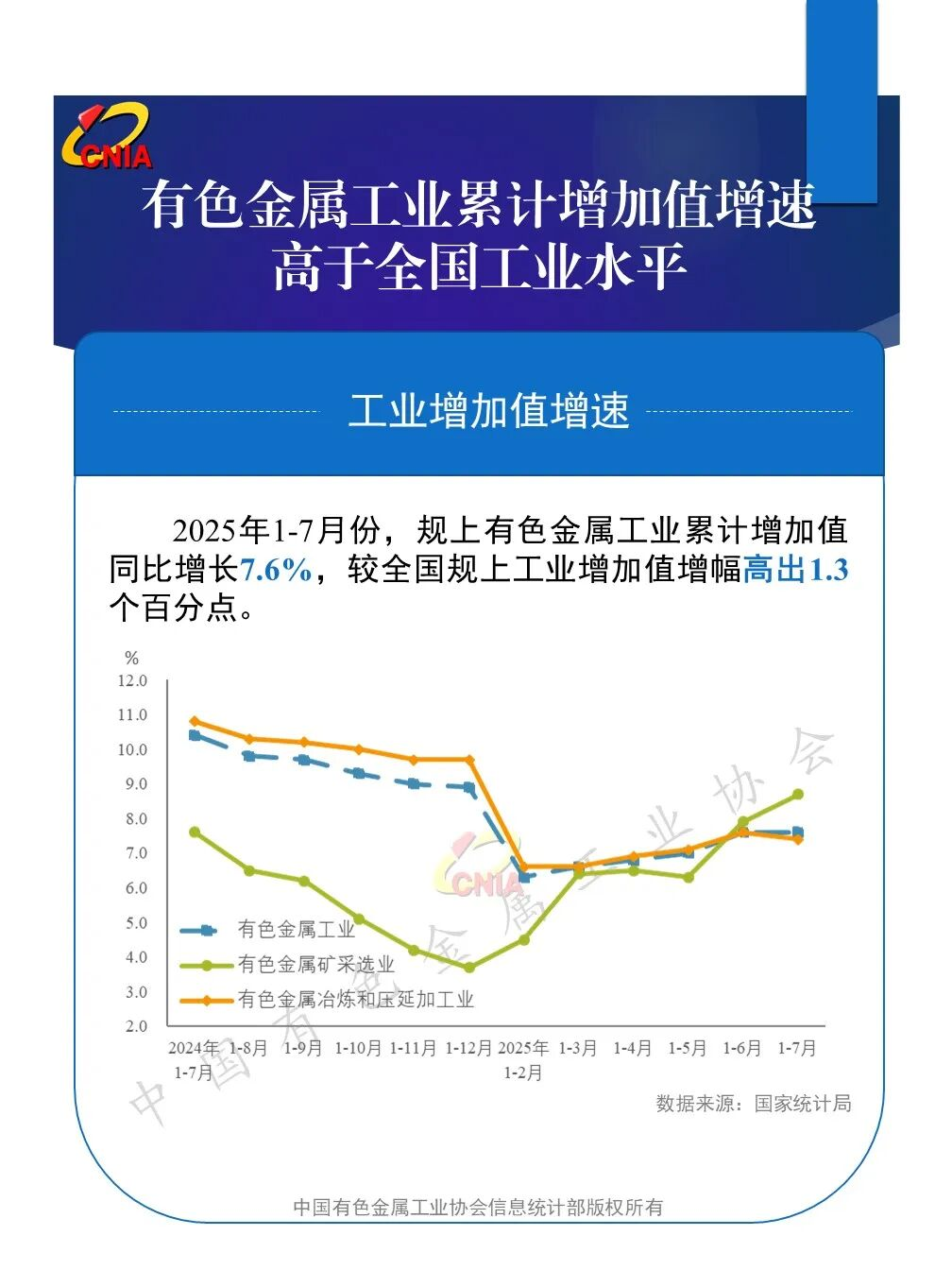 7月份,規(guī)模以上有色金屬工業(yè)增加值同比實際增長7.7%(增加值增速均為扣除價格因素的實際增長率,下同);1—7月份,規(guī)模以上有色金屬工業(yè)增加值同比實際增長7.6%,增幅與上半年持平,比規(guī)模以上工業(yè)增加值增幅高1.3個百分點。