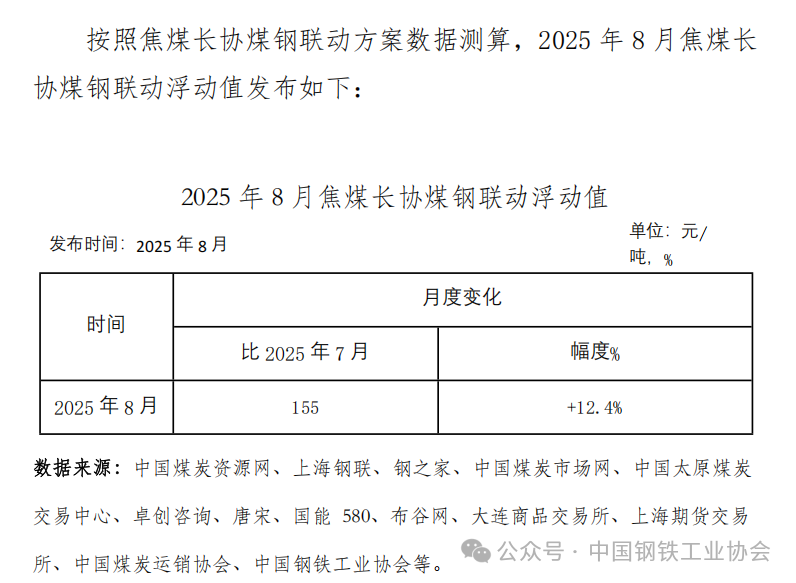 2025年8月焦煤長(zhǎng)協(xié)煤鋼聯(lián)動(dòng)浮動(dòng)值