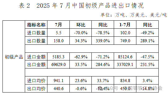 2025年7月,我國出口初級產(chǎn)品(鋼坯、生鐵、直接還原鐵及再生鋼鐵原料)158.0萬噸,環(huán)比增長34.3%;出口均價440.6美元/噸,環(huán)比基本持平。1-7月,我國累計出口初級產(chǎn)品749.0萬噸,同比增長2.9倍;出口均價450.0美元/噸,同比下跌14.8%,降幅較1-6月小幅收窄。7月,我國進口初級產(chǎn)品5.5萬噸,環(huán)比大幅下降70.0%;進口均價941.1美元/噸,環(huán)比增長23.6%。1-7月,我國累計進口初級產(chǎn)品102.0萬噸,同比下降49.2%;進口均價834.8美元/噸,同比上漲3.4%。進出相抵,1-7月我國折合粗鋼凈出口7384萬噸,較上年同期增加1424萬噸,同比增長23.9%。