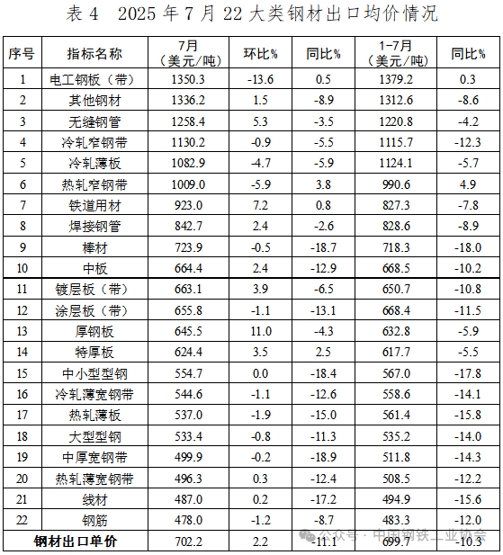 7月,22大類鋼材品種中,有8類品種出口量環(huán)比下降,減量主要來自熱軋板卷產(chǎn)品。其中,熱軋薄寬鋼帶、大型型鋼、冷軋薄寬鋼帶和鐵道用材等4個品種出口量環(huán)比降幅超過10%,中厚寬鋼帶、焊接鋼管、無縫鋼管及熱軋薄板等品種出口量環(huán)比也出現(xiàn)一定程度下降。其余14類品種出口量環(huán)比出現(xiàn)增長,增量主要來自鍍層板(帶)、涂層板(帶)和棒材。1-7月,鍍層板(帶)是累計出口量最大的品種,占鋼材出口總量的17.9%;熱軋板卷產(chǎn)品累計出口量同比繼續(xù)呈下降態(tài)勢,但中厚寬鋼帶和熱軋薄寬鋼帶兩個主要品種累計出口量同比降幅小幅收窄;線材和棒材累計出口量同比持續(xù)擴大。7月,多數(shù)品種出口單價保持在較穩(wěn)定區(qū)間,電工鋼板(帶)出口單價環(huán)比跌幅最為明顯,為13.6%;厚鋼板出口單價環(huán)比漲幅最大,為11.0%。1-7月,電工鋼板(帶)和熱軋窄鋼帶2個品種出口單價同比已實現(xiàn)正增長,另有冷軋窄鋼帶等部分品種出口單價降幅同比收窄。