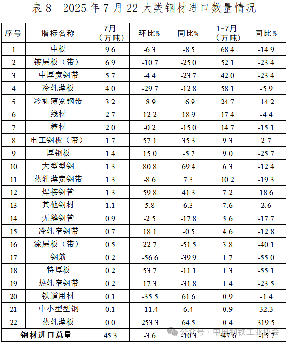 2025年7月,我國鋼材進口規(guī)模持續(xù)萎縮,為近10年以來單月進口量最低水平。各主要品種進口量環(huán)比大多下降,進口前5位的品種占當月我國鋼材進口總量的比重較上月有所下降。7月,我國鋼材的主要進口來源及結構仍保持穩(wěn)定,除自中國臺灣進口鋼材環(huán)比回升外,自其它主要國家進口鋼材數(shù)量環(huán)比均下降,且降幅大于總體水平。