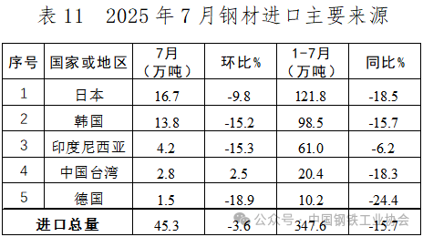 7月,我國鋼材進口結構總體保持穩(wěn)定,鋼材進口規(guī)模雖持續(xù)減少,但環(huán)比降幅也在同步收窄。分國別來看,自日本、韓國、印度尼西亞和德國進口的鋼材環(huán)比持續(xù)減少。