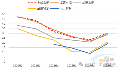 盡管水泥熟料綜合銷量出現(xiàn)下降,但得益于煤炭采購(gòu)價(jià)格下跌和精細(xì)化管理促使可控成本下降,2025年上半年公司水泥熟料綜合毛利率達(dá)到30.1%,較去年同期提升6.7個(gè)百分點(diǎn),絕對(duì)毛利率水平略微低于華新水泥(主要海外帶動(dòng)),超過國(guó)內(nèi)多數(shù)主要上市公司,在行業(yè)中處于領(lǐng)先地位,水泥產(chǎn)品盈利能力較強(qiáng)。