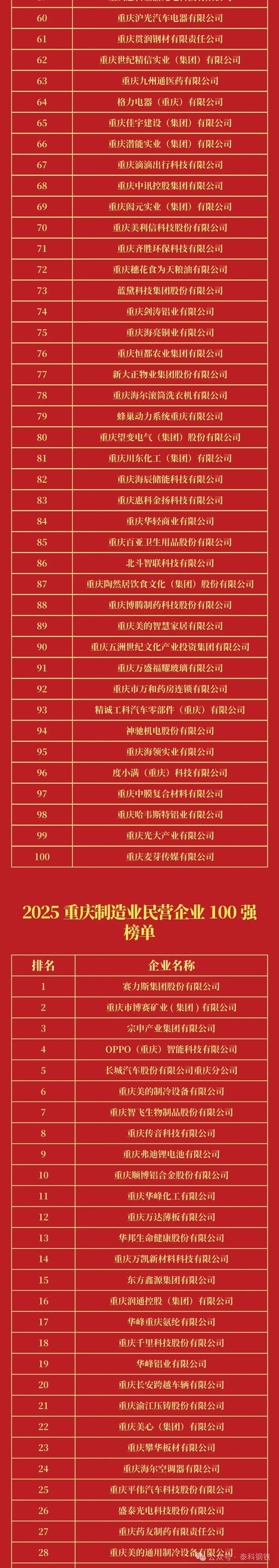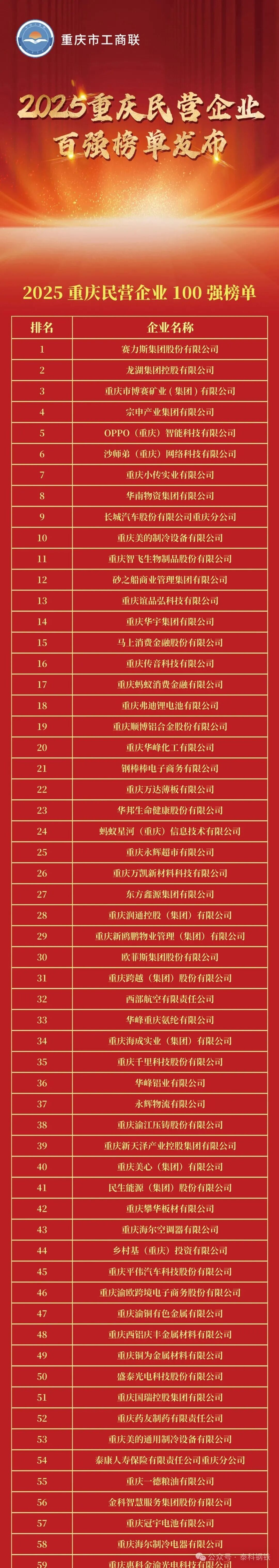9月19日,重慶市工商聯(lián)、市發(fā)改委、市經(jīng)信委舉辦“2025重慶民營企業(yè)100強發(fā)布會”會上,2025重慶民營企業(yè)100強和2025重慶制造業(yè)民營企業(yè)100強榜單正式發(fā)布。鋼鐵、冶金行業(yè),賽博礦業(yè)、萬達薄板、攀華板材等上榜民營企業(yè)100強,足航釩鈦鋼鐵、永航鋼鐵集團等上榜制造業(yè)民營企業(yè)100。