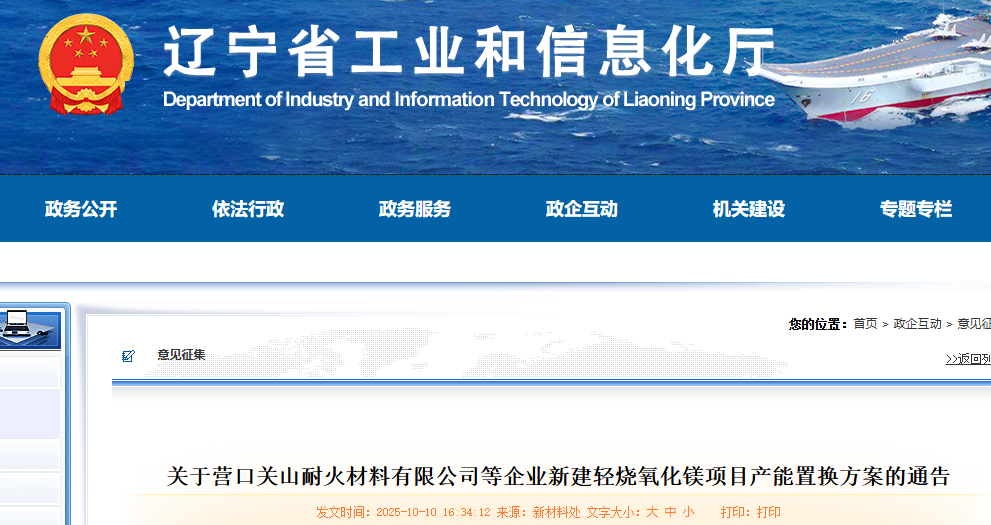 按照《遼寧省人民政府辦公廳關(guān)于推進(jìn)菱鎂行業(yè)高質(zhì)量發(fā)展的實(shí)施意見》(遼政辦發(fā)〔2023〕15號(hào))、《遼寧省菱鎂礦浮選及鎂砂行業(yè)產(chǎn)能置換辦法》(遼工信建材〔2024〕18號(hào))要求,根據(jù)菱鎂行業(yè)專項(xiàng)整治工作進(jìn)展,經(jīng)企業(yè)申請、市級(jí)審核、省級(jí)復(fù)核,我廳于2025年9月19日至10月9日,對營口關(guān)山耐火材料有限公司等企業(yè)新建輕燒氧化鎂項(xiàng)目產(chǎn)能置換方案進(jìn)行了公示,公示期間營口關(guān)山耐火材料有限公司等12家企業(yè)無異議,現(xiàn)予通告。