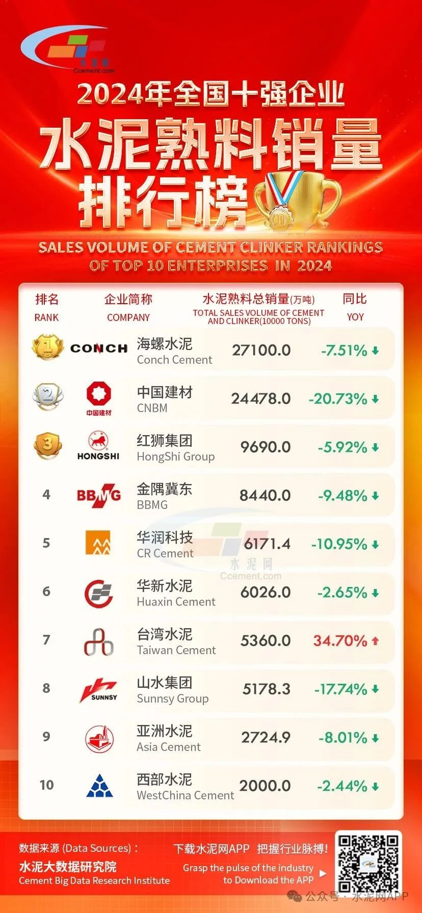 近日,中國水泥網(wǎng)發(fā)布2024年中國水泥熟料總銷量TOP10排行榜。從排名來看,2024年海螺水泥熟料總銷量27100萬噸,超越中國建材位居榜首,華新水泥、臺灣水泥均超過山水水泥,分別提升至第六位、第七位,山水水泥則下降至第八位,西部水泥進入前十位。從銷量變化來看,僅有一家企業(yè)銷量出現(xiàn)增長,九家出現(xiàn)下降。2024年,臺灣水泥度完成土耳其、葡萄牙相關(guān)資產(chǎn)收購后,水泥熟料同比銷量大增34.7%;深度參與海外市場的華新水泥、西部水泥明顯跑贏國內(nèi)大盤,降幅較小,分別為2.65%、2.44%;中國建材、山水水泥降幅較大,特別是中國建材,水泥熟料銷量較同期下降近21%,山水水泥超過17%;華潤建材科技降幅在11%左右,金隅冀東、亞洲水泥、海螺水泥、紅獅控股集團均低于10%,降幅分別為9.48%、8.01%、7.51%、5.92%。(注:水泥企業(yè)水泥熟料銷量是水泥銷量和熟料外銷量之和(不含自用熟料),既包括企業(yè)在國內(nèi)的銷量也包括在海外的銷量;天瑞水泥暫未披露2024年度年報,不參與此次排名)