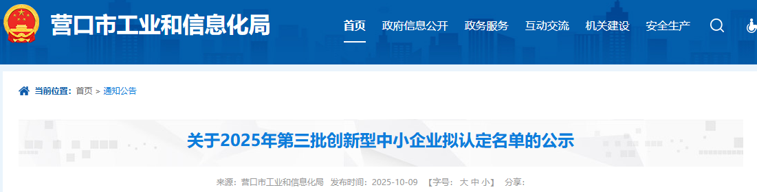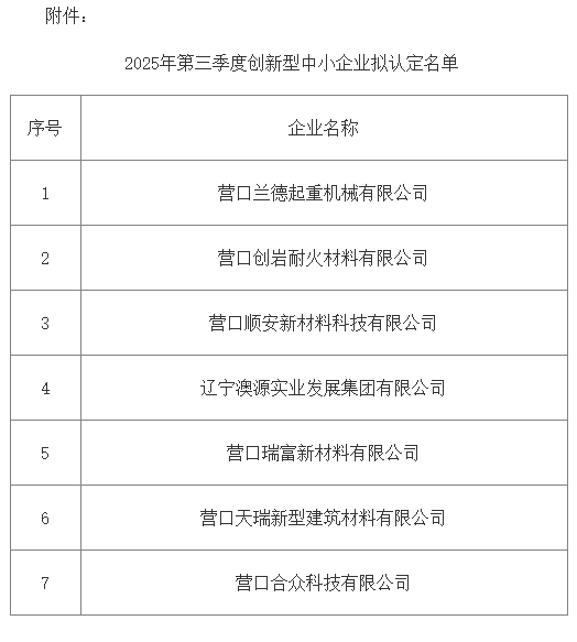 按省工信廳《關(guān)于做好2025年度創(chuàng)新型中小企業(yè)申報(bào)工作的通知》要求,經(jīng)企業(yè)登錄優(yōu)質(zhì)中小企業(yè)梯度培育平臺自愿申報(bào),各縣(市)區(qū)、園區(qū)工信主管部門推薦,營口市工信局初審,擬認(rèn)定營口創(chuàng)巖耐火材料有限公司等7家企業(yè)為2025年第三季度創(chuàng)新型中小企業(yè),現(xiàn)將通過名單予以公示。任何單位或個人對公示有異議的,可在公示期內(nèi)與市工信局聯(lián)系。