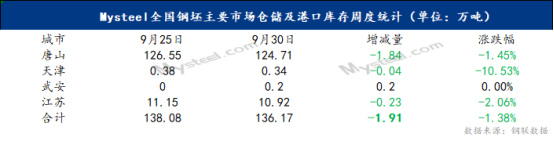 通過對全國六城20家主流倉庫及港口進行調(diào)查統(tǒng)計,當前9月30日鋼坯倉儲庫存136.17萬噸,周環(huán)比減少1.91萬噸。從重點區(qū)域來看,唐山鋼坯庫存124.71萬噸,周環(huán)比下降1.84萬噸。其中三大主流倉儲庫存周環(huán)比增加0.86萬噸,下游調(diào)坯廠需求減少,鋼坯倉儲庫存由降轉增。而港口庫存因為出口資源疏港下降2.7萬噸,港口庫存的下降導致唐山整體庫存的下降。
