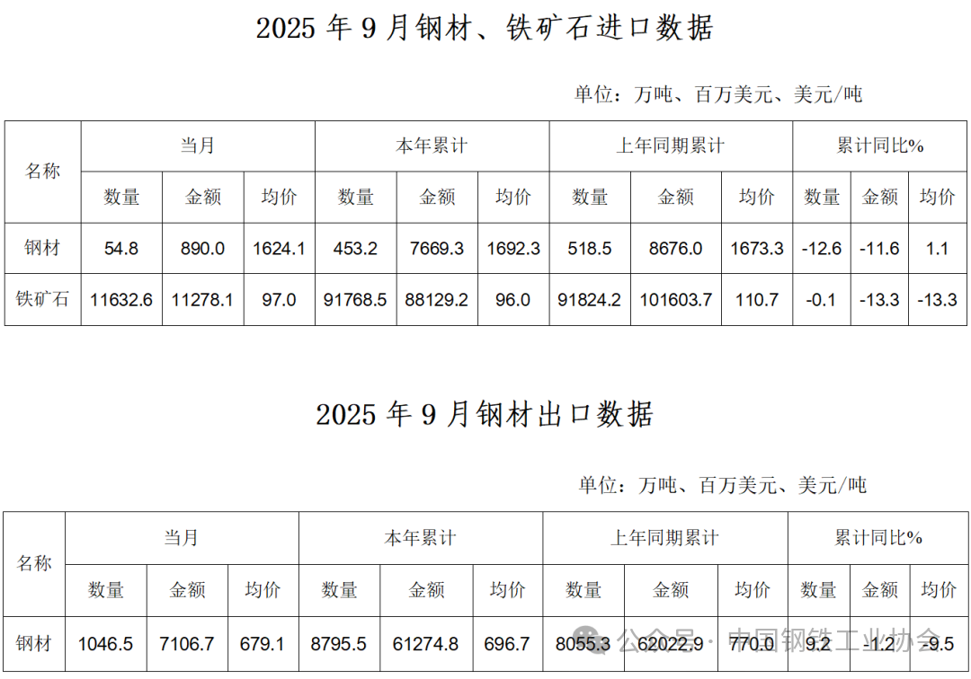 根據(jù)海關(guān)統(tǒng)計快訊數(shù)據(jù),2025年9月,我國進口鋼材54.8萬噸,環(huán)比增加4.8萬噸、增幅9.6%;均價1624.1美元/噸,環(huán)比下跌27.5美元/噸、降幅1.7%。1-9月累計進口鋼材453.2萬噸,同比減少65.3萬噸、降幅12.6%。2025年9月,我國進口鐵礦石11632.6萬噸,環(huán)比增加1110.1萬噸、增幅10.5%;均價97.0美元/噸,環(huán)比上漲4.2美元/噸、漲幅4.6%。1-9月累計進口鐵礦石91768.5萬噸,同比減少55.7萬噸、降幅0.1%。2025年9月,我國出口鋼材1046.5萬噸,環(huán)比增加95.5萬噸、增幅10.0%;均價679.1美元/噸,環(huán)比下跌18.9美元/噸、跌幅2.7%。1-9月累計出口鋼材8795.5萬噸,同比增加740.2萬噸、增幅9.2%。