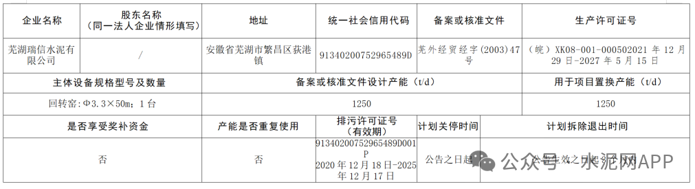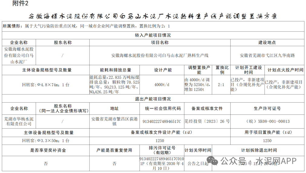 根據(jù)《水泥玻璃行業(yè)產(chǎn)能置換實施辦法(2024年本)》等文件要求,蕪湖南方水泥有限公司將2#、3#水泥熟料生產(chǎn)線(產(chǎn)能均為4500t/d)通過補產(chǎn)能方式分別增加到5700t/d、5800t/d,置換產(chǎn)能來自本企業(yè)1#水泥熟料生產(chǎn)線(產(chǎn)能為2500t/d),產(chǎn)能調(diào)整置換比例為1:1。安徽海螺水泥股份有限公司白馬山水泥廠擬將1條4000t/d水泥熟料生產(chǎn)線通過補產(chǎn)能方式增加到5250t/d,置換產(chǎn)能來自蕪湖市華楊水泥有限責任公司(產(chǎn)能1250t/d)、蕪湖瑞信水泥有限公司(產(chǎn)能1250t/d),置換比例為2:1。
