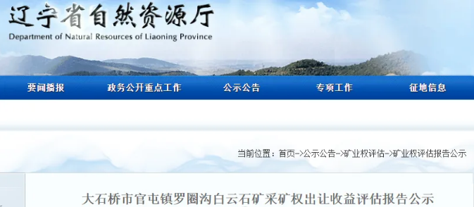 大石橋市官屯鎮(zhèn)羅圈溝白云石礦采礦權(quán)出讓收益評(píng)估報(bào)告通過(guò)遼寧省自然資源廳門戶網(wǎng)站向社會(huì)公示,公示10個(gè)工作日。如有異議,請(qǐng)于公示之日起10個(gè)工作日內(nèi)以電話方式先向省自然資源廳礦產(chǎn)資源保護(hù)監(jiān)督處提出簡(jiǎn)要意見,隨后及時(shí)將書面意見反饋到省自然資源廳礦產(chǎn)資源保護(hù)監(jiān)督處。