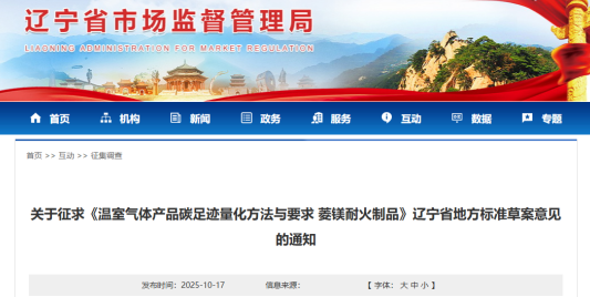 《溫室氣體產(chǎn)品碳足跡量化方法與要求 菱鎂耐火制品》遼寧省地方標(biāo)準(zhǔn)草案已完成,現(xiàn)公開征求意見。請(qǐng)于2025年11月17日前,將意見反饋至遼寧省市場(chǎng)監(jiān)督管理局標(biāo)準(zhǔn)處。