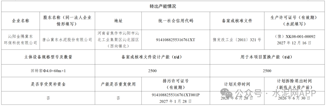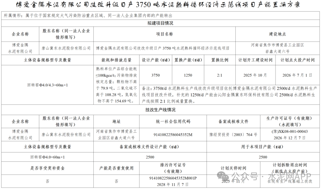 置換方案顯示,博愛金隅3750t/d水泥熟料生產(chǎn)線技改升級項(xiàng)目依托博愛金隅水泥有限公司2500t/d水泥熟料生產(chǎn)線項(xiàng)目技改升級,補(bǔ)充的1250t/d產(chǎn)能由沁陽金隅冀東環(huán)保科技有限公司2500t/d水泥熟料生產(chǎn)線按照2:1比例減量置換。
