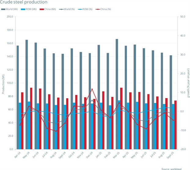 2025年9月全球70個(gè)納入世界鋼鐵協(xié)會(huì)統(tǒng)計(jì)國(guó)家/地區(qū)的粗鋼產(chǎn)量為1.418億噸,同比下降1.6%。
