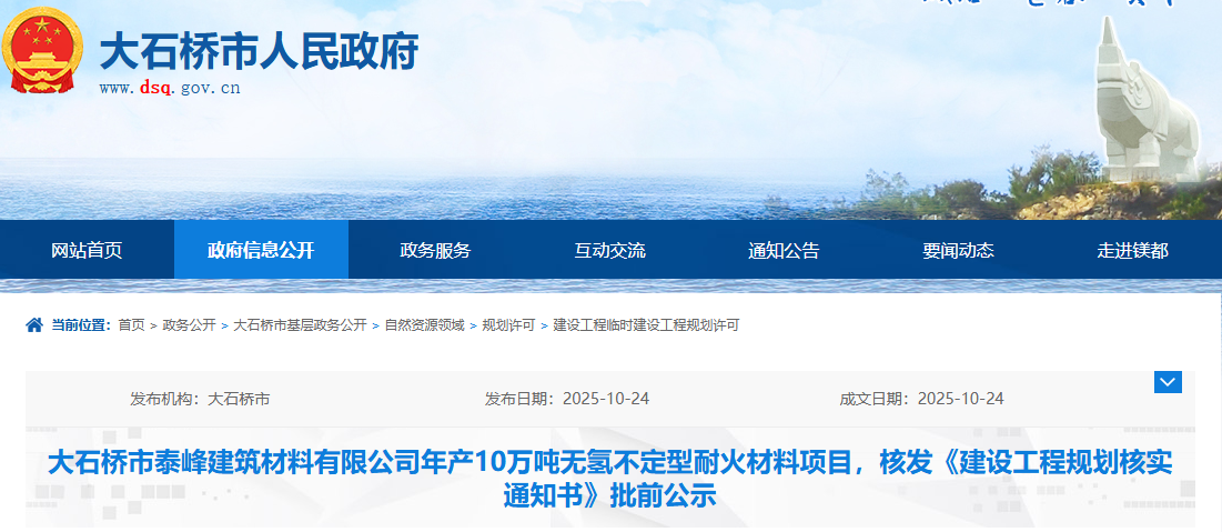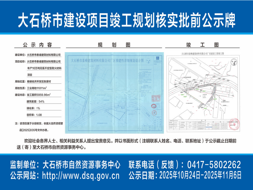 大石橋市泰峰建筑材料有限公司年產(chǎn)10萬噸無氫不定型耐火材料項目,核發(fā)《建設工程規(guī)劃核實通知書》批前公示