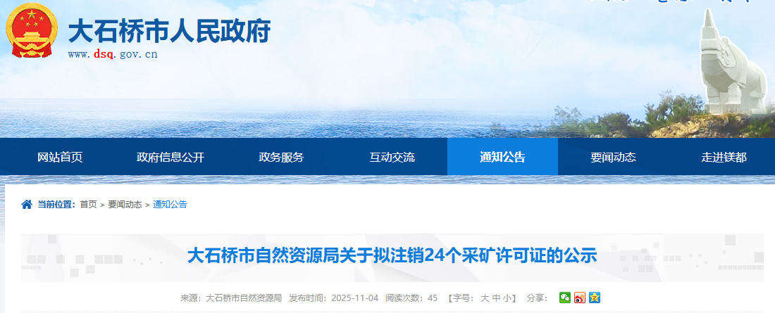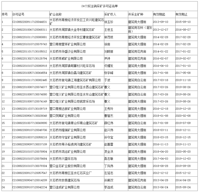 大石橋市南樓經(jīng)濟開發(fā)區(qū)工農(nóng)興旺建筑石礦等24個采礦許可證,礦業(yè)權(quán)人在有效期屆滿前未按規(guī)定申請辦理延續(xù)登記,采礦許可證已自行廢止。根據(jù)《礦產(chǎn)資源開采登記管理辦法》(國務院令第241號)和《自然資源部關于進一步完善礦產(chǎn)資源勘查開采登記管理的通知》(自然資規(guī)[2023]4號)第十八條,大石橋市自然資源局擬對上述采礦許可證予以注銷,現(xiàn)進行公示。