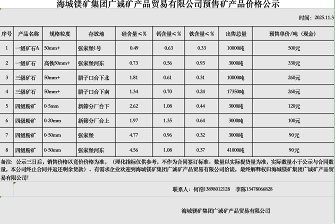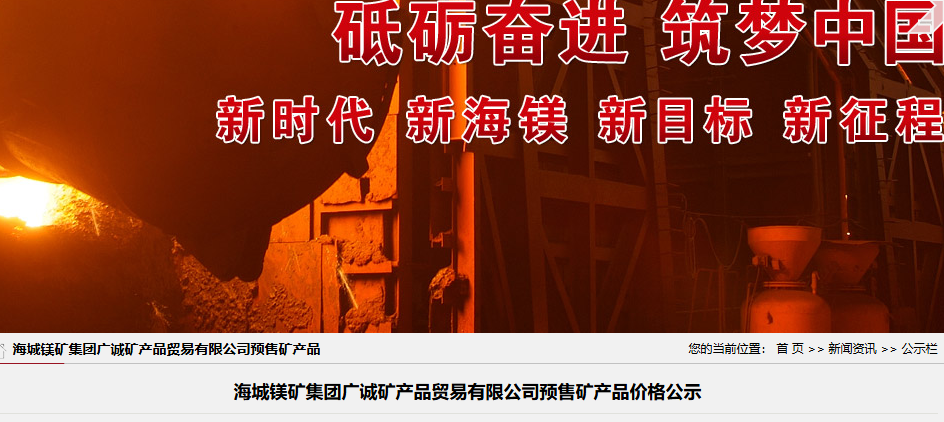 海城鎂礦集團廣誠礦產(chǎn)品貿(mào)易有限公司預(yù)售礦產(chǎn)品價格公示