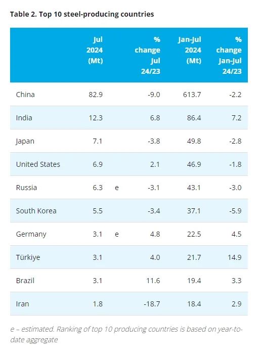 世界鋼鐵協(xié)會(huì)數(shù)據(jù)顯示,2024年7月全球71個(gè)納入世界鋼鐵協(xié)會(huì)統(tǒng)計(jì)國(guó)家的粗鋼產(chǎn)量為1.528億噸,同比下降4.7%。其中,中國(guó)粗鋼產(chǎn)量同比下降9.0%,降至8290萬(wàn)噸。印度7月粗鋼產(chǎn)量為1230萬(wàn)噸,同比增加6.8%;今年1-7月粗鋼產(chǎn)量為0.864億噸,同比增加7.2%。