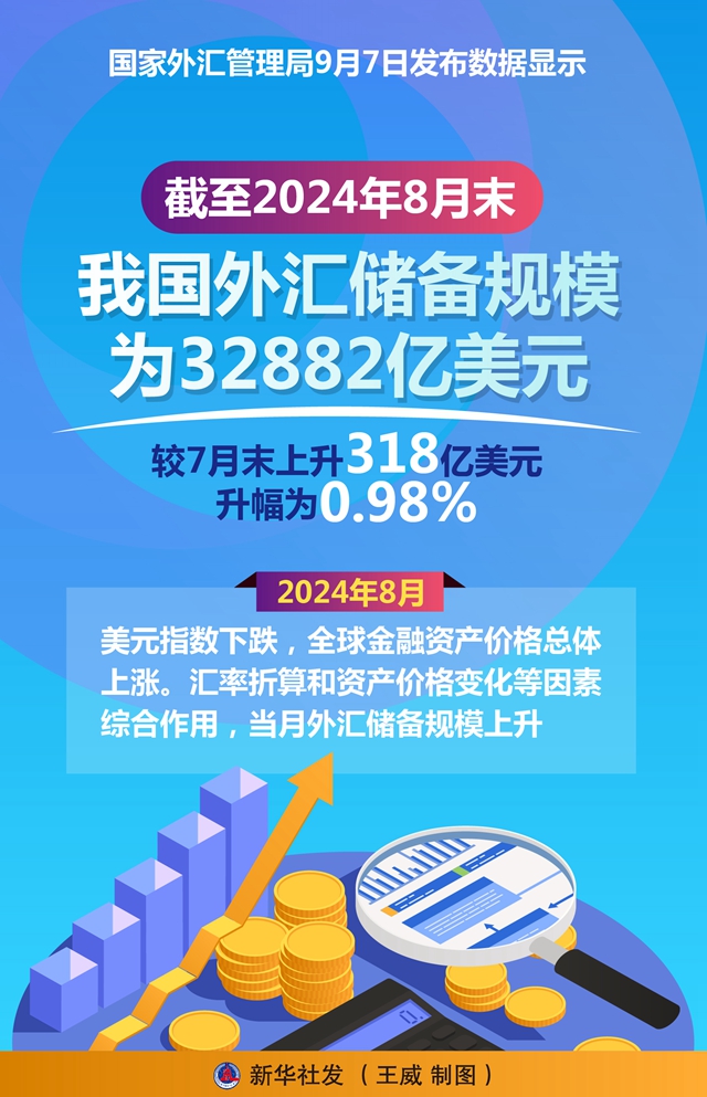 國(guó)家外匯管理局統(tǒng)計(jì)數(shù)據(jù)顯示:截至8月末,我國(guó)外匯儲(chǔ)備規(guī)模為32882億美元,較7月末上升318億美元,升幅為0.98%。8月,受主要經(jīng)濟(jì)體宏觀數(shù)據(jù)和貨幣政策預(yù)期等因素影響,美元指數(shù)下跌,全球金融資產(chǎn)價(jià)格總體上漲。匯率折算和資產(chǎn)價(jià)格變化等因素綜合作用,當(dāng)月外匯儲(chǔ)備規(guī)模上升。