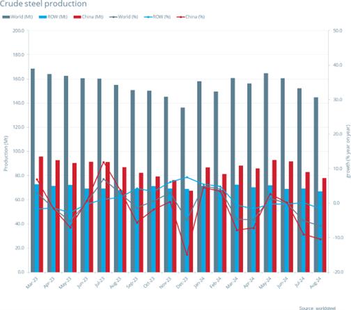 2024年8月全球71個(gè)納入世界鋼鐵協(xié)會統(tǒng)計(jì)國家的粗鋼產(chǎn)量為1.448億噸,同比下降6.5%。