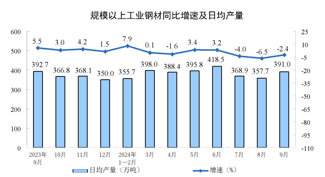 據(jù)國家統(tǒng)計局公布的數(shù)據(jù),9月份,我國粗鋼產(chǎn)量7707萬噸,同比下降6.1%;生鐵產(chǎn)量6676萬噸,同比下降6.7%;鋼材產(chǎn)量11731萬噸,同比下降2.4%。