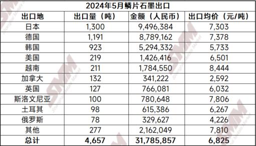 2024年5月天然鱗片石墨出口4657.5噸,同比下降20.97%,環(huán)比下降9.24%,.