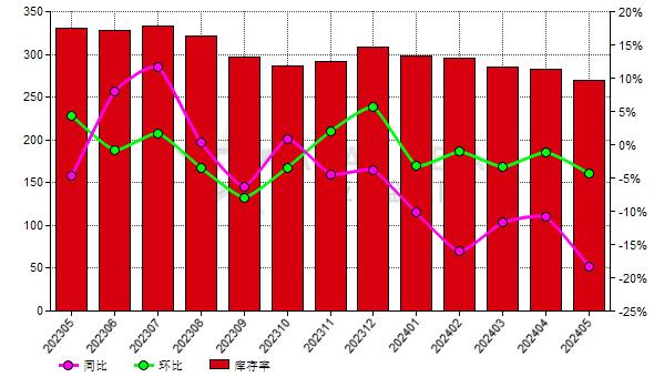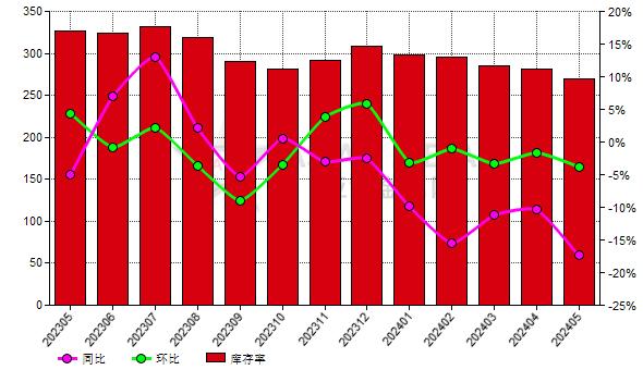 5月份中國氧化鋁在產生產商進口鋁土礦庫存率270.26%,同比降低17.38%,環(huán)比降低3.80%。