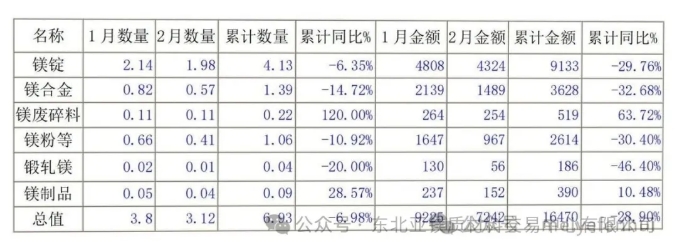 2025年1-2月中國各類鎂產(chǎn)品出口統(tǒng)計(jì)情況 (單位:萬噸、萬美元)