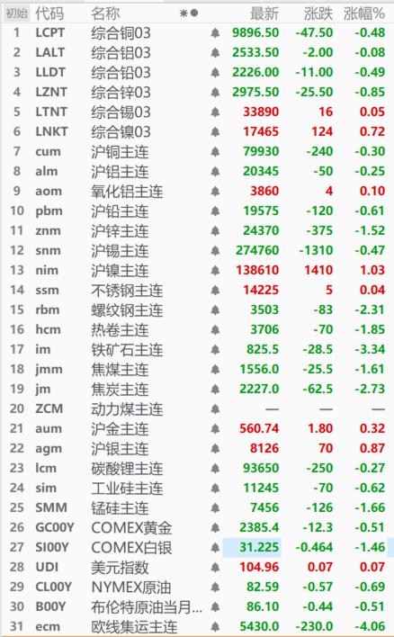 截至今日日間收盤,內(nèi)盤基本金屬普跌,滬鎳、氧化鋁分別漲1.03%、0.10%,滬鋅跌1.52%,其他金屬跌幅在0.70%以下。