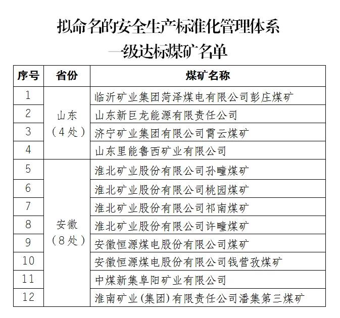 公示擬命名的安全生產(chǎn)標(biāo)準(zhǔn)化管理體系一級達(dá)標(biāo)煤礦名單